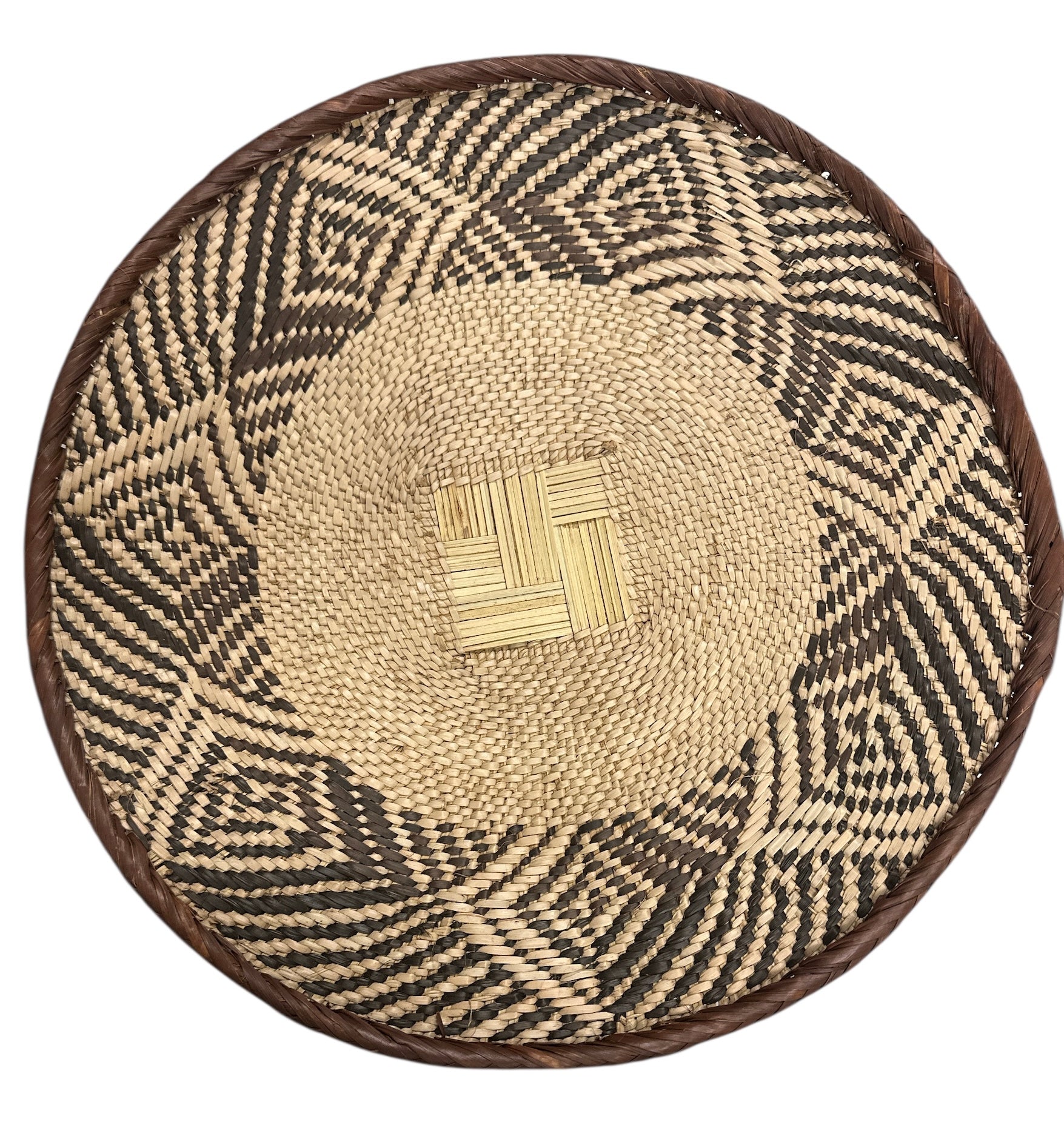 African Basket - Tonga - Zimbabwe Binga Basket Traditionally, the baskets were (and still are) used for carrying maize or sorghum from the fields and then winnowing the grain. A traditional design includes striped a spider web type pattern, and a lightning pattern with a distinctive square bottom design to form the foundation of the basket. Binga baskets are light, and popular to hang as a wall decor. The colors are neutral with beautiful geometric designs. They are created from naturally dyed palm leaves.