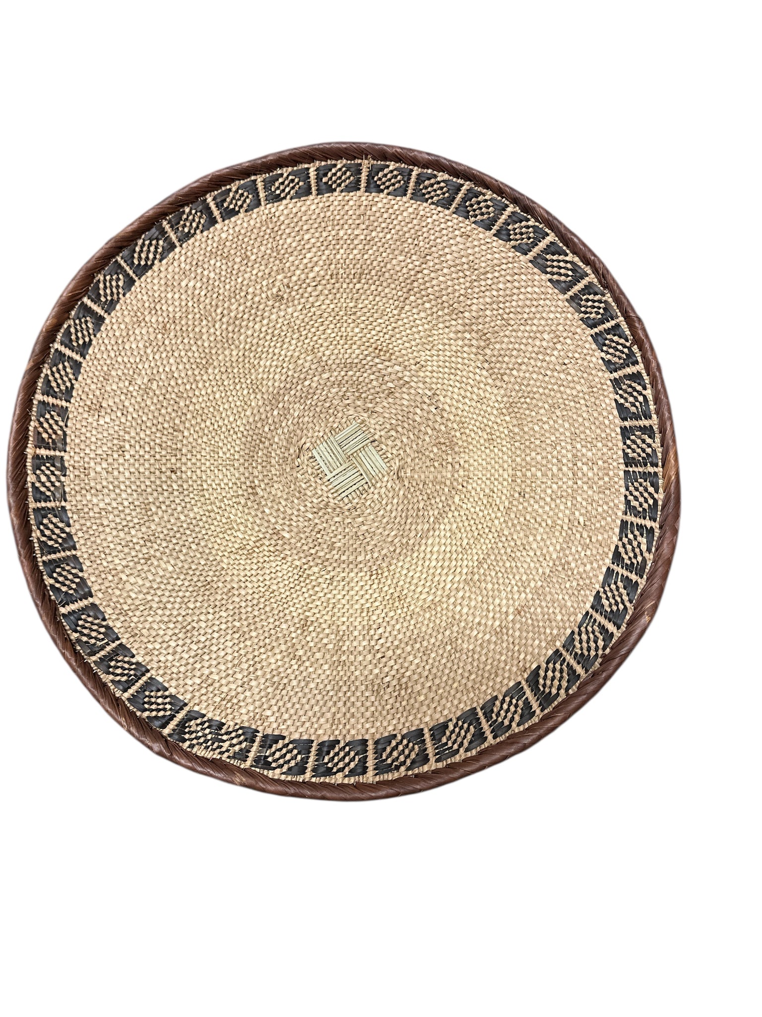 African Basket - Tonga - Zimbabwe Binga Basket Traditionally, the baskets were (and still are) used for carrying maize or sorghum from the fields and then winnowing the grain. A traditional design includes striped a spider web type pattern, and a lightning pattern with a distinctive square bottom design to form the foundation of the basket. Binga baskets are light, and popular to hang as a wall decor. The colors are neutral with beautiful geometric designs. They are created from naturally dyed palm leaves.