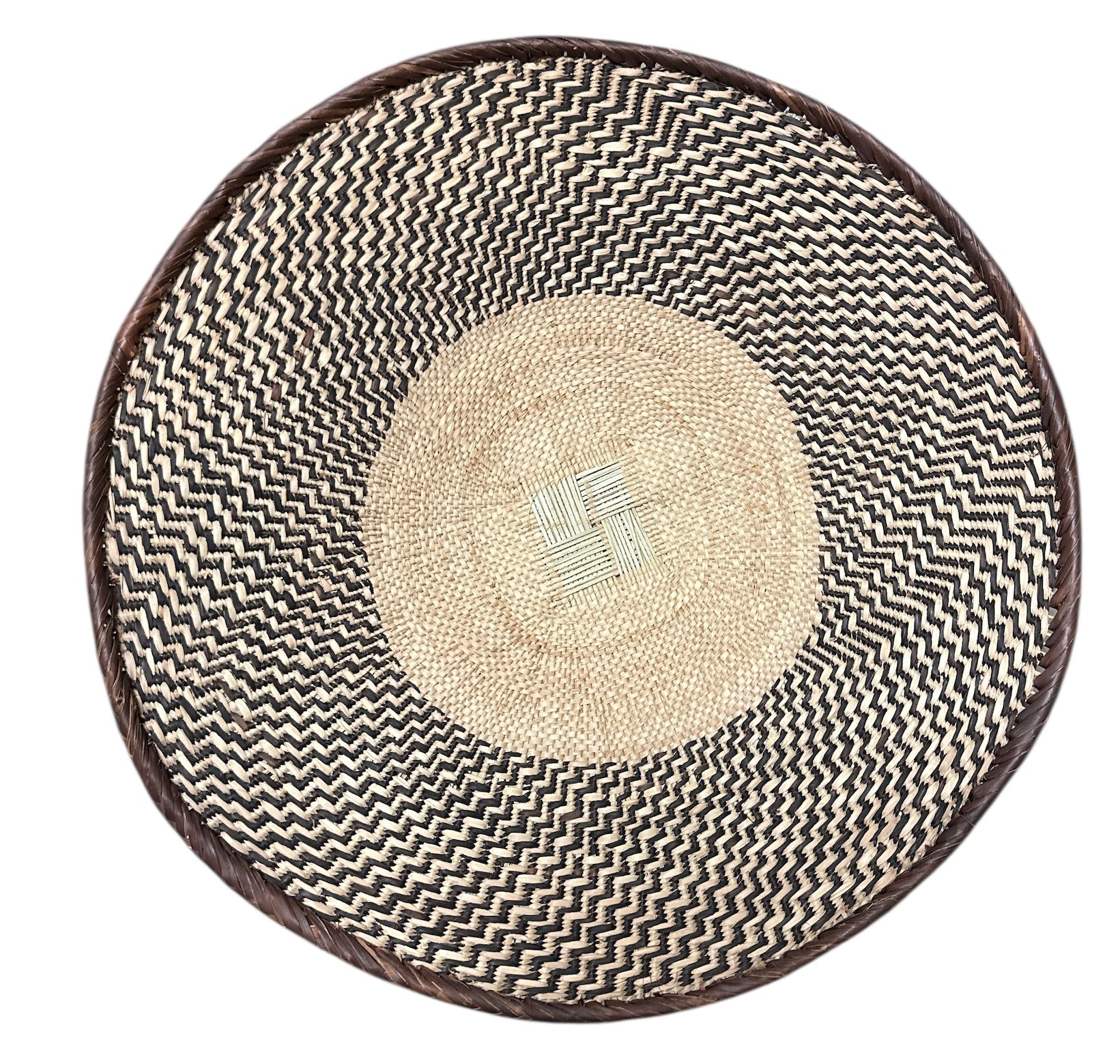 African Basket - Tonga - Zimbabwe Binga Basket Traditionally, the baskets were (and still are) used for carrying maize or sorghum from the fields and then winnowing the grain. A traditional design includes striped a spider web type pattern, and a lightning pattern with a distinctive square bottom design to form the foundation of the basket. Binga baskets are light, and popular to hang as a wall decor. The colors are neutral with beautiful geometric designs. They are created from naturally dyed palm leaves.
