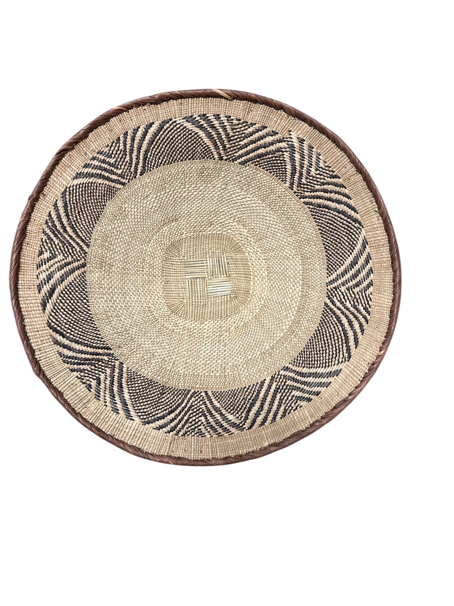 African Basket - Tonga - Zimbabwe Binga Basket Traditionally, the baskets were (and still are) used for carrying maize or sorghum from the fields and then winnowing the grain. A traditional design includes striped a spider web type pattern, and a lightning pattern with a distinctive square bottom design to form the foundation of the basket. Binga baskets are light, and popular to hang as a wall decor. The colors are neutral with beautiful geometric designs. They are created from naturally dyed palm leaves.