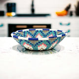 RL271This perfect center piece Rwanda basket, African basket, Boho basket made of sweet grass and sisal. It can be used as bread/fruit bowl,wall art, wall decor. It comes with a loop in the back which, can be used as a wall hanging basket or given out as a gift. It's a stunning one-of-a-kind pieces rich in cultural meaning and purpose -- a perfect center piece, bread/fruit bowl, or wall hanging. Whether as a wall hanging or displayed as a centerpiece, these traditional baskets lend versatility around any home. Each bowl is intricately hand woven by The African Home Goods in Rwanda