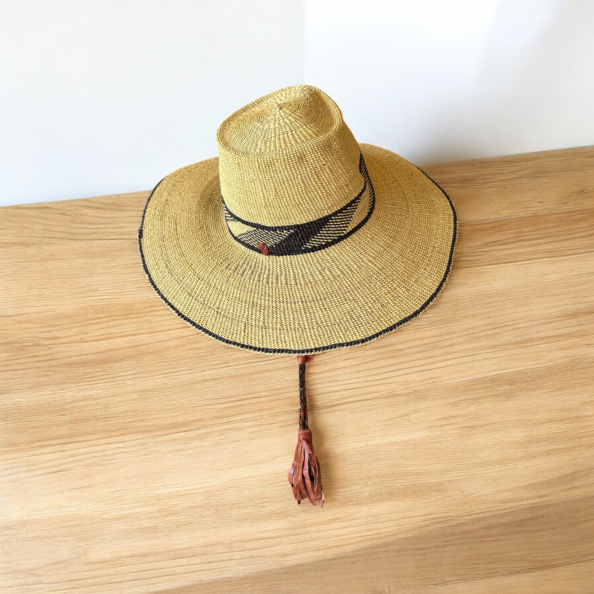 Ghanaian Straw Hats With Wide Brim Band & Leather - Navy Blue Stripe
