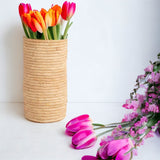 Intricately crafted with timeless tradition, this carefully dyed raffia fiber and sweet grass cylindrical vase makes a stunning statement piece. One or more of these vases will make a globally conscious and stylistic addition to your home.