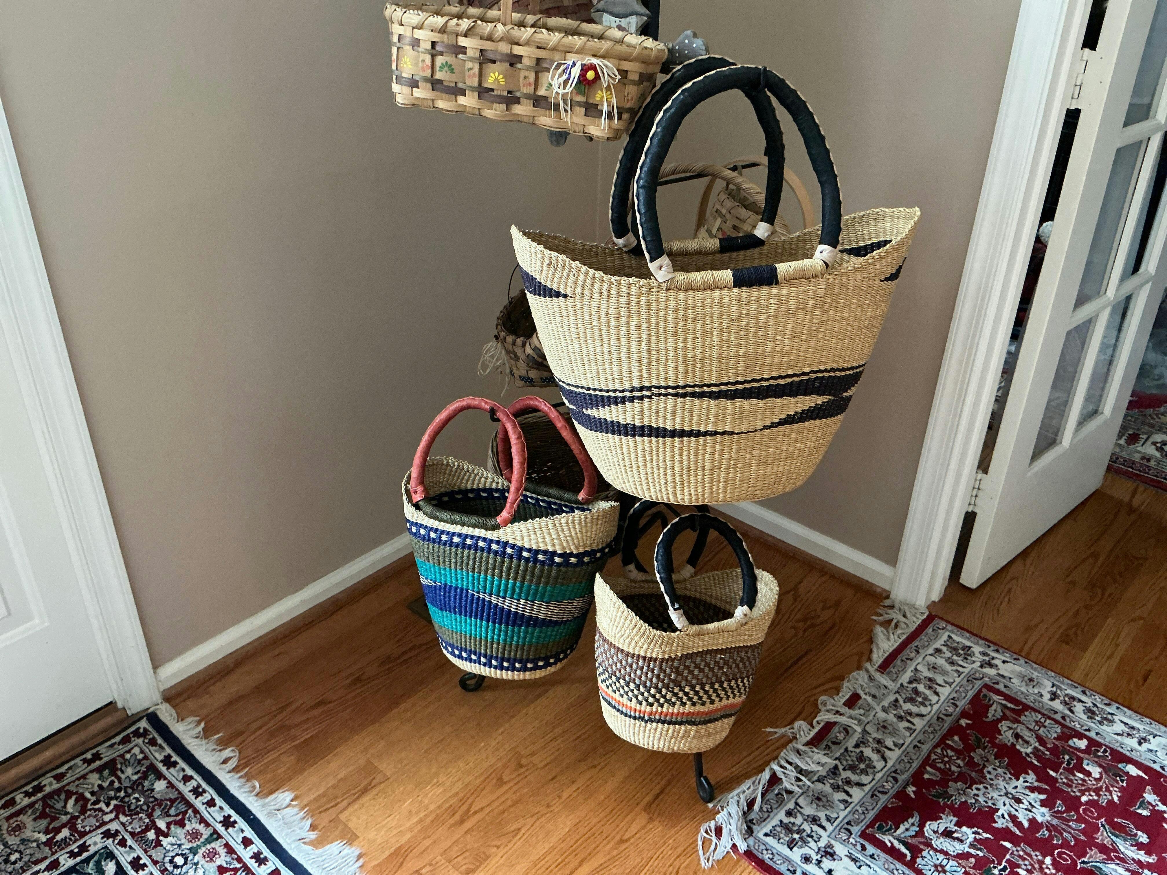 GUL048African Market Basket - Ghana Bolga market basket makes a great gift basket! These baskets are a traditional shape from the Bolgatanga region of Northern Ghana. Artisans in the Bolgatanga region of Ghana weave these beautiful and durable baskets from thick, tough elephant grass. Bolga basket is a very popular size for children, shoppers, busy mothers and picnic planners worldwide. Bolga baskets stand up to use, practical, sustainable, remain functional, and beautiful for years. Handwoven in Ghana made from local elephant grass. Each basket is one of a kind, in a unique pattern, and he leather wrapped handle adds to the durability. Incredibly sturdy and versatile basket is the perfect home accessory, plant pot, toy basket, Easter egg basket, or market basket. Please note: To reduce postage costs and packaging these baskets are flattened for postage, this does not harm them in any way, and simple instructions on how to reshape the baskets are included, once wet they pretty much bounce back to the original shape with a little help from you