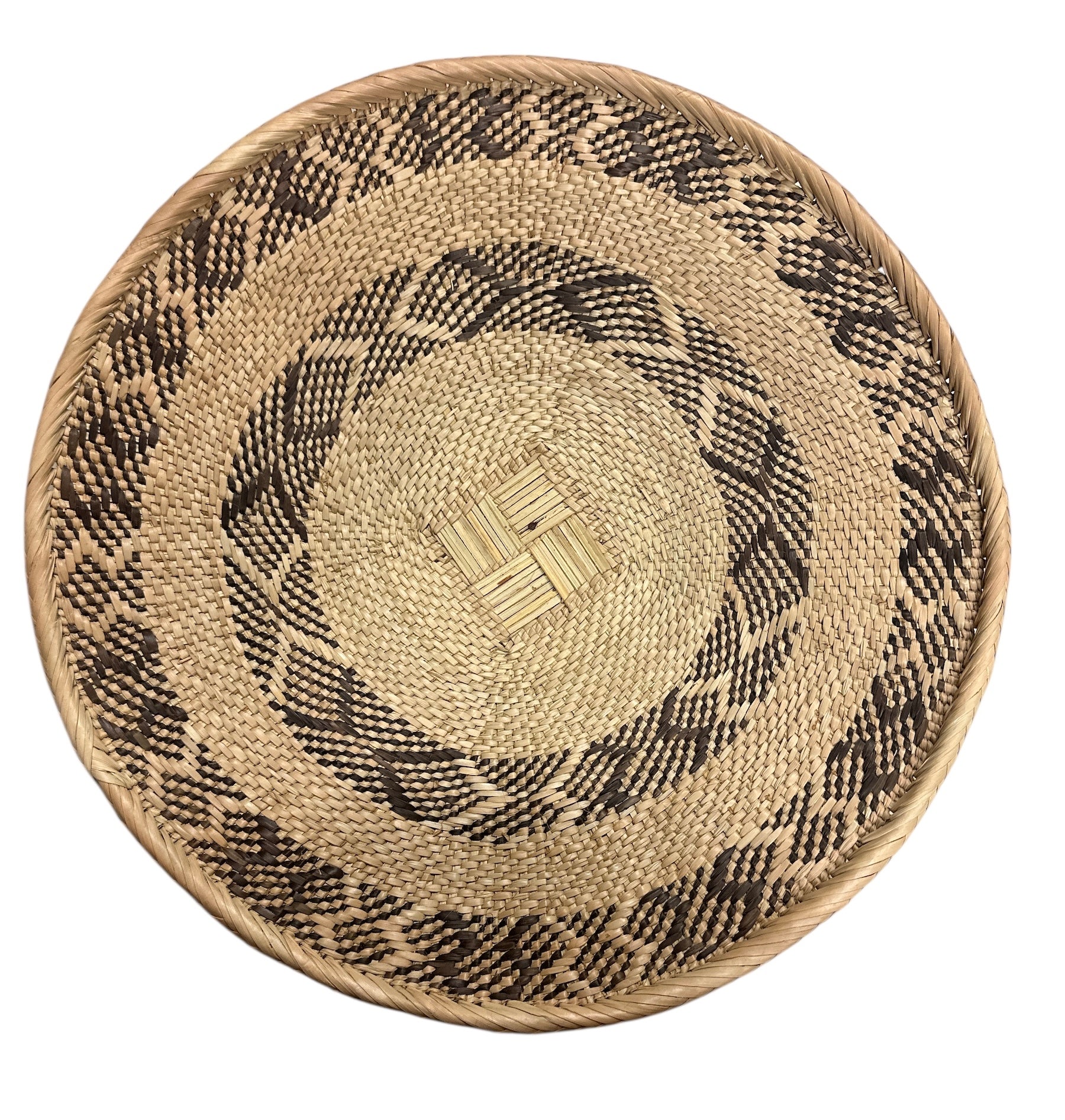 African Basket - Tonga - Zimbabwe Binga Basket Traditionally, the baskets were (and still are) used for carrying maize or sorghum from the fields and then winnowing the grain. A traditional design includes striped a spider web type pattern, and a lightning pattern with a distinctive square bottom design to form the foundation of the basket. Binga baskets are light, and popular to hang as a wall decor. The colors are neutral with beautiful geometric designs. They are created from naturally dyed palm leaves.