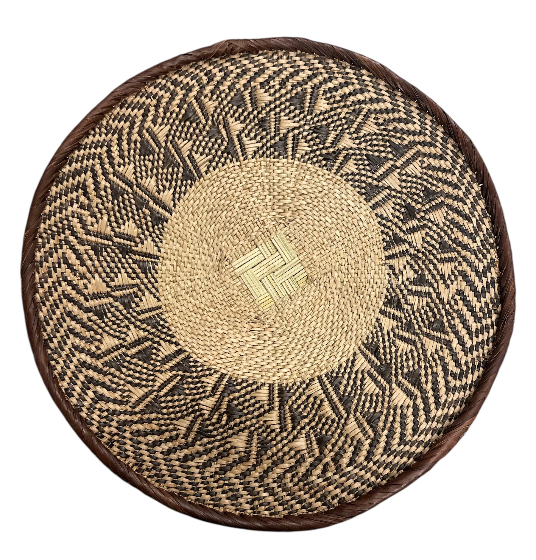 African Basket - Tonga - Zimbabwe Binga Basket Traditionally, the baskets were (and still are) used for carrying maize or sorghum from the fields and then winnowing the grain. A traditional design includes striped a spider web type pattern, and a lightning pattern with a distinctive square bottom design to form the foundation of the basket. Binga baskets are light, and popular to hang as a wall decor. The colors are neutral with beautiful geometric designs. They are created from naturally dyed palm leaves.