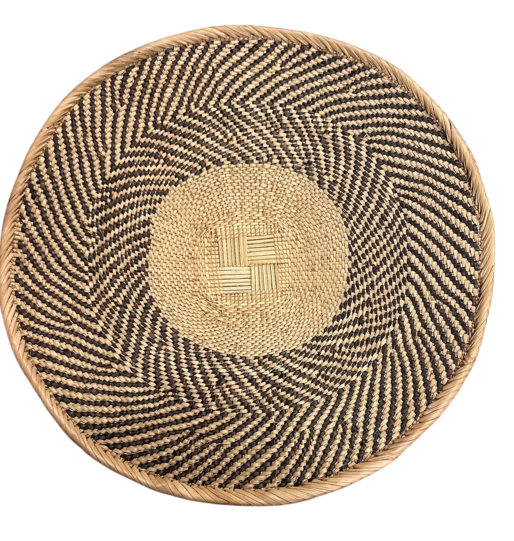 African Basket - Tonga - Zimbabwe Binga Basket Traditionally, the baskets were (and still are) used for carrying maize or sorghum from the fields and then winnowing the grain. A traditional design includes striped a spider web type pattern, and a lightning pattern with a distinctive square bottom design to form the foundation of the basket. Binga baskets are light, and popular to hang as a wall decor. The colors are neutral with beautiful geometric designs. They are created from naturally dyed palm leaves.
