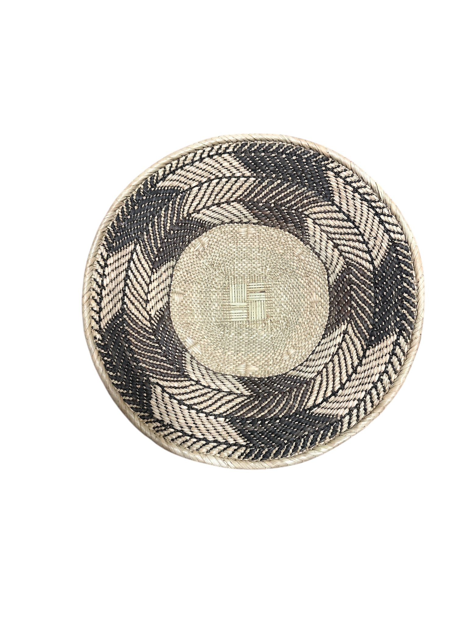 African Basket - Tonga - Zimbabwe Binga Basket Traditionally, the baskets were (and still are) used for carrying maize or sorghum from the fields and then winnowing the grain. A traditional design includes striped a spider web type pattern, and a lightning pattern with a distinctive square bottom design to form the foundation of the basket. Binga baskets are light, and popular to hang as a wall decor. The colors are neutral with beautiful geometric designs. They are created from naturally dyed palm leaves.