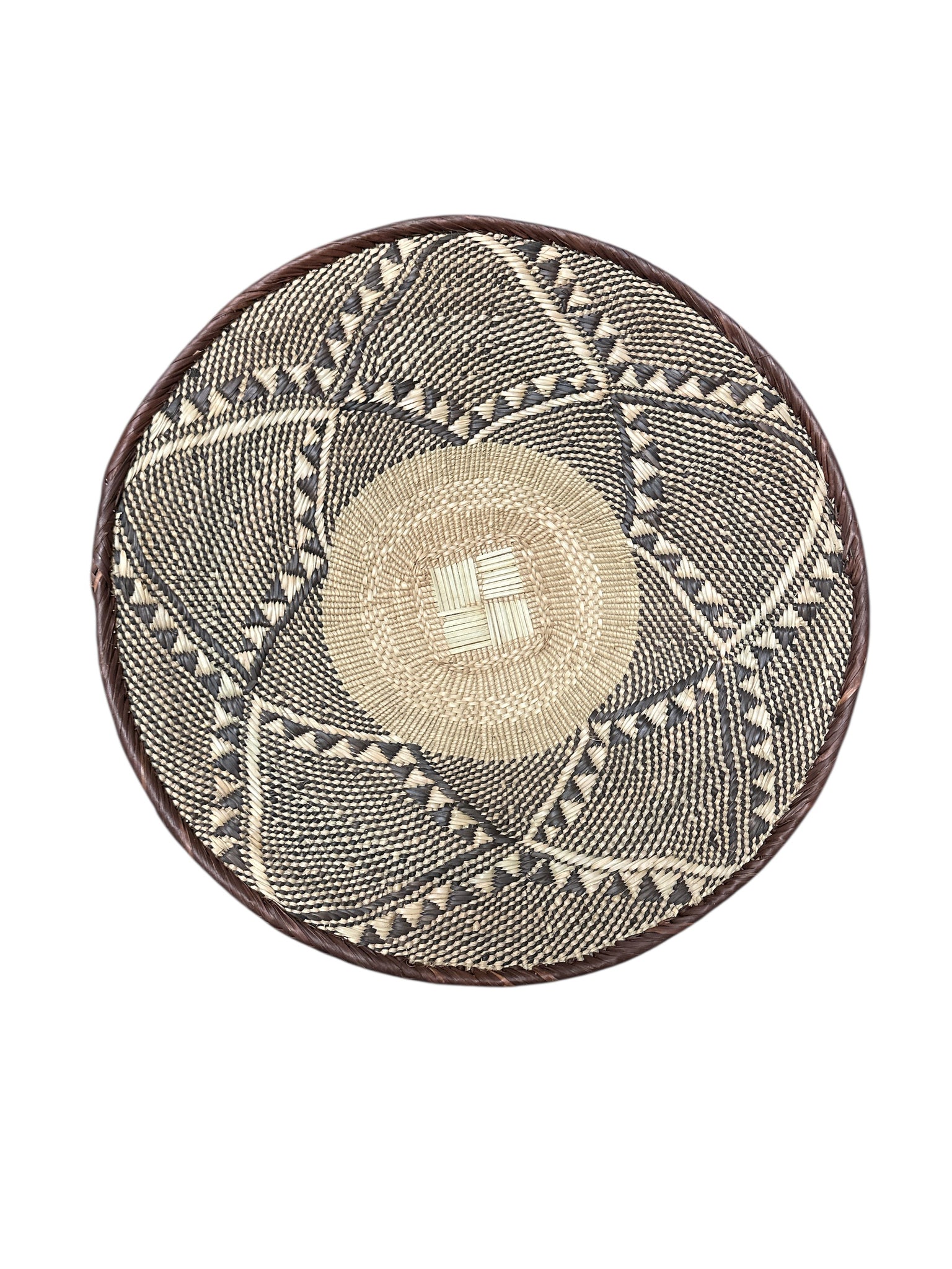 African Basket - Tonga - Zimbabwe Binga Basket Traditionally, the baskets were (and still are) used for carrying maize or sorghum from the fields and then winnowing the grain. A traditional design includes striped a spider web type pattern, and a lightning pattern with a distinctive square bottom design to form the foundation of the basket. Binga baskets are light, and popular to hang as a wall decor. The colors are neutral with beautiful geometric designs. They are created from naturally dyed palm leaves.