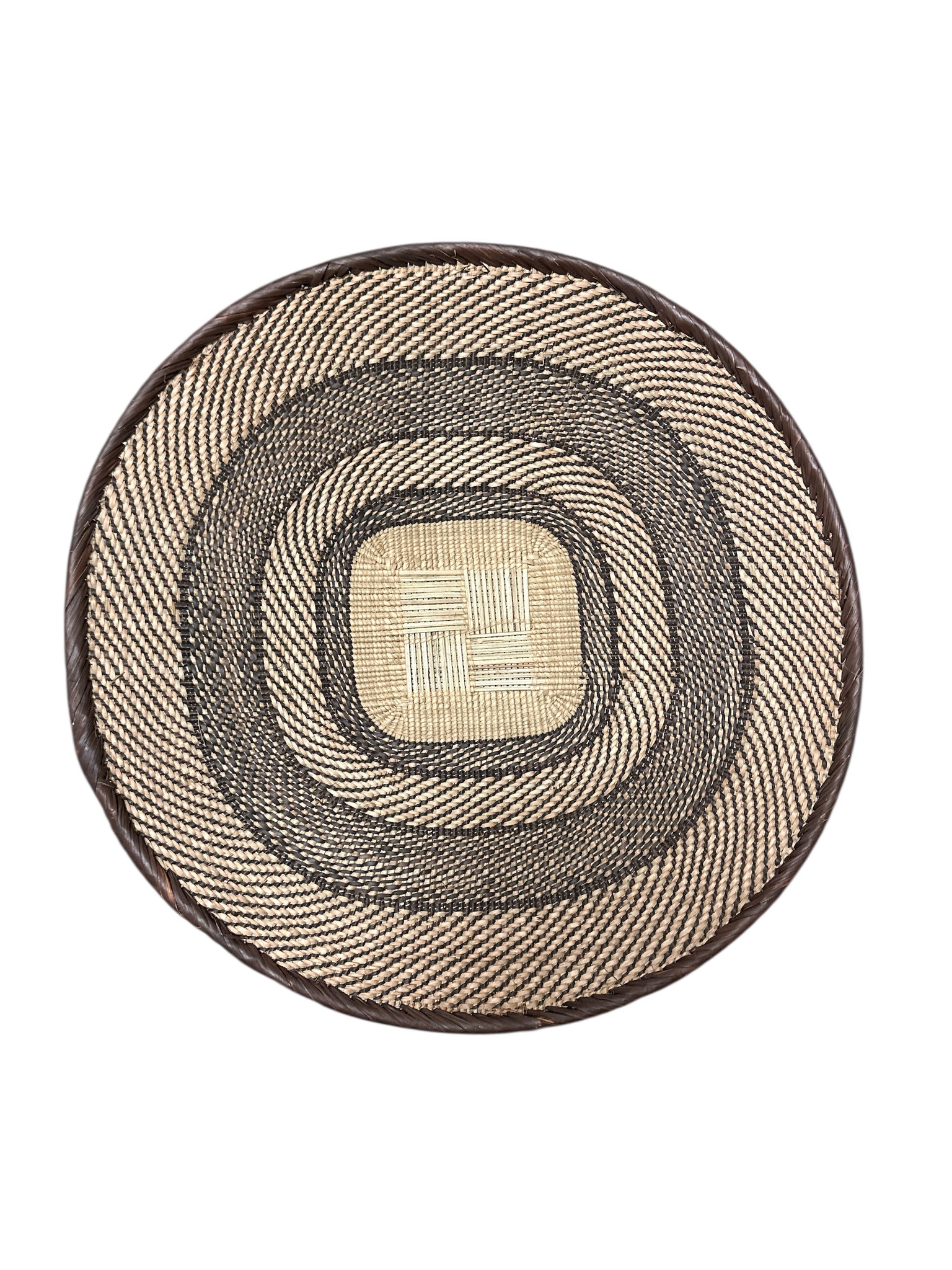 African Basket - Tonga - Zimbabwe Binga Basket Traditionally, the baskets were (and still are) used for carrying maize or sorghum from the fields and then winnowing the grain. A traditional design includes striped a spider web type pattern, and a lightning pattern with a distinctive square bottom design to form the foundation of the basket. Binga baskets are light, and popular to hang as a wall decor. The colors are neutral with beautiful geometric designs. They are created from naturally dyed palm leaves.