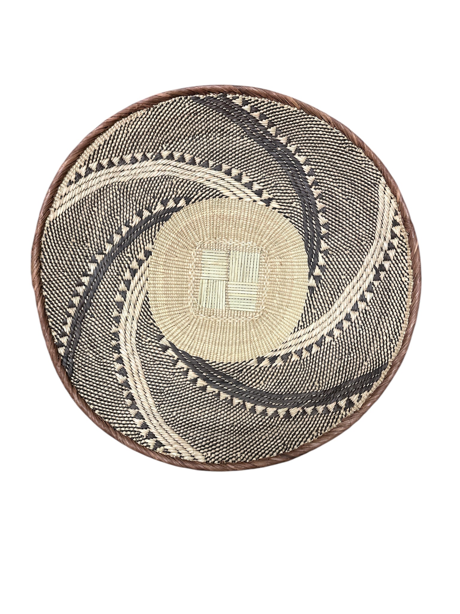 African Basket - Tonga - Zimbabwe Binga Basket Traditionally, the baskets were (and still are) used for carrying maize or sorghum from the fields and then winnowing the grain. A traditional design includes striped a spider web type pattern, and a lightning pattern with a distinctive square bottom design to form the foundation of the basket. Binga baskets are light, and popular to hang as a wall decor. The colors are neutral with beautiful geometric designs. They are created from naturally dyed palm leaves.