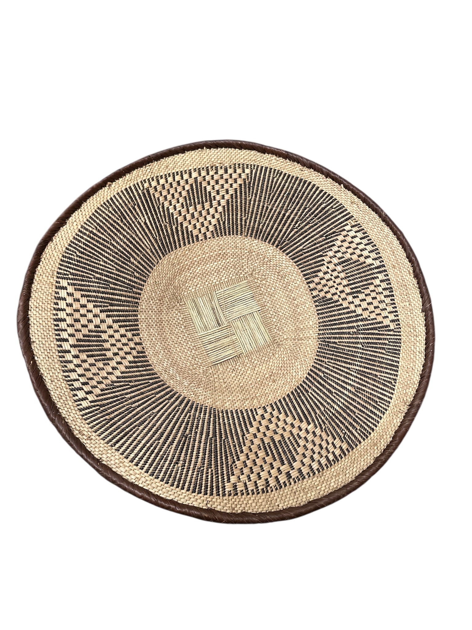 African Basket - Tonga - Zimbabwe Binga Basket Traditionally, the baskets were (and still are) used for carrying maize or sorghum from the fields and then winnowing the grain. A traditional design includes striped a spider web type pattern, and a lightning pattern with a distinctive square bottom design to form the foundation of the basket. Binga baskets are light, and popular to hang as a wall decor. The colors are neutral with beautiful geometric designs. They are created from naturally dyed palm leaves.
