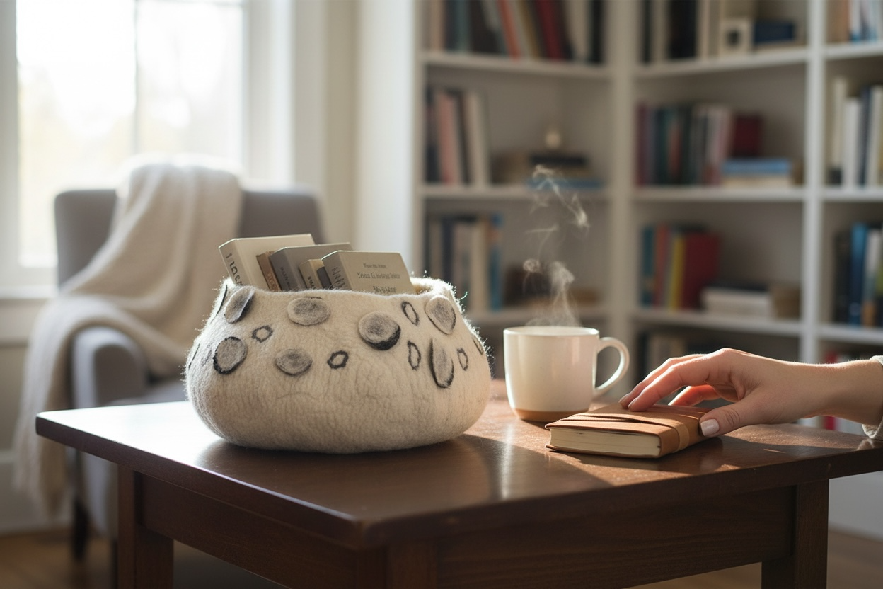 The Ghana basket is felted using 100% locally sourced South African Merino wool. Each step, from dyeing the fabric to felting the wool, is done by hand by local women in South Africa