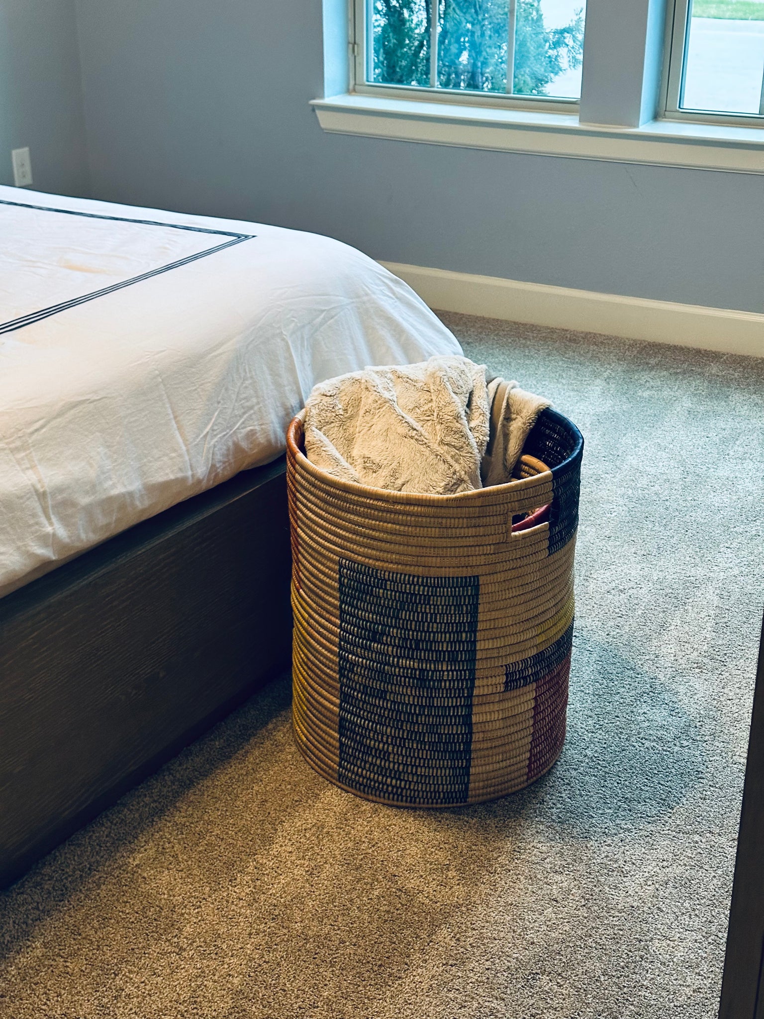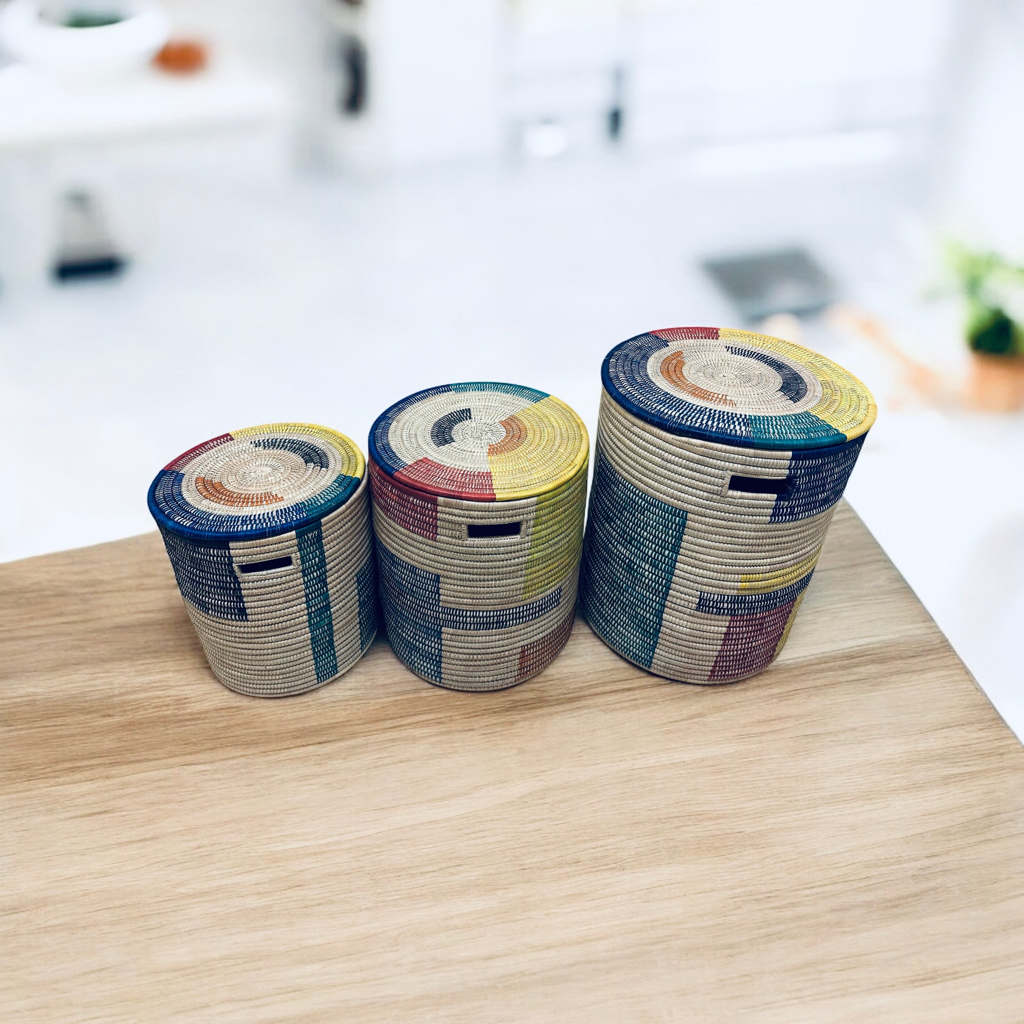 The classic collection of baskets, consists of neatly handwoven baskets out of local mulaza palm leaves. Baskets come in various sizes and are dyed with natural dyes, made with indigenous recipes. All cylinders and washing baskets come with a mahogany handle.